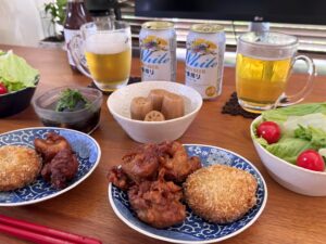 蓮根メンチと地元の肉屋の鶏唐揚。