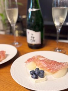 おつまみは豊水と生ハム、クリームチーズとブルーベリー。