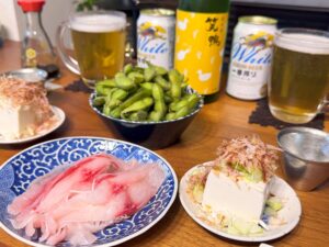 茨城県で買って来た鯉のあらい、枝豆、豆腐。