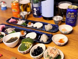 生雲丹(きうに)、もずく酢、ブロッコリー、丹波産黒豆煮、