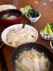 味噌汁、ブロッコリー、ほうれん草お浸しも一緒に。
