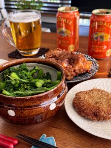 おつまみは茨城で買った蓮根メンチと鶏唐揚げ、