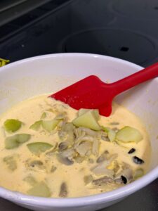私は玉ねぎとキノコ以外に茹でたじゃがいもも加えた。